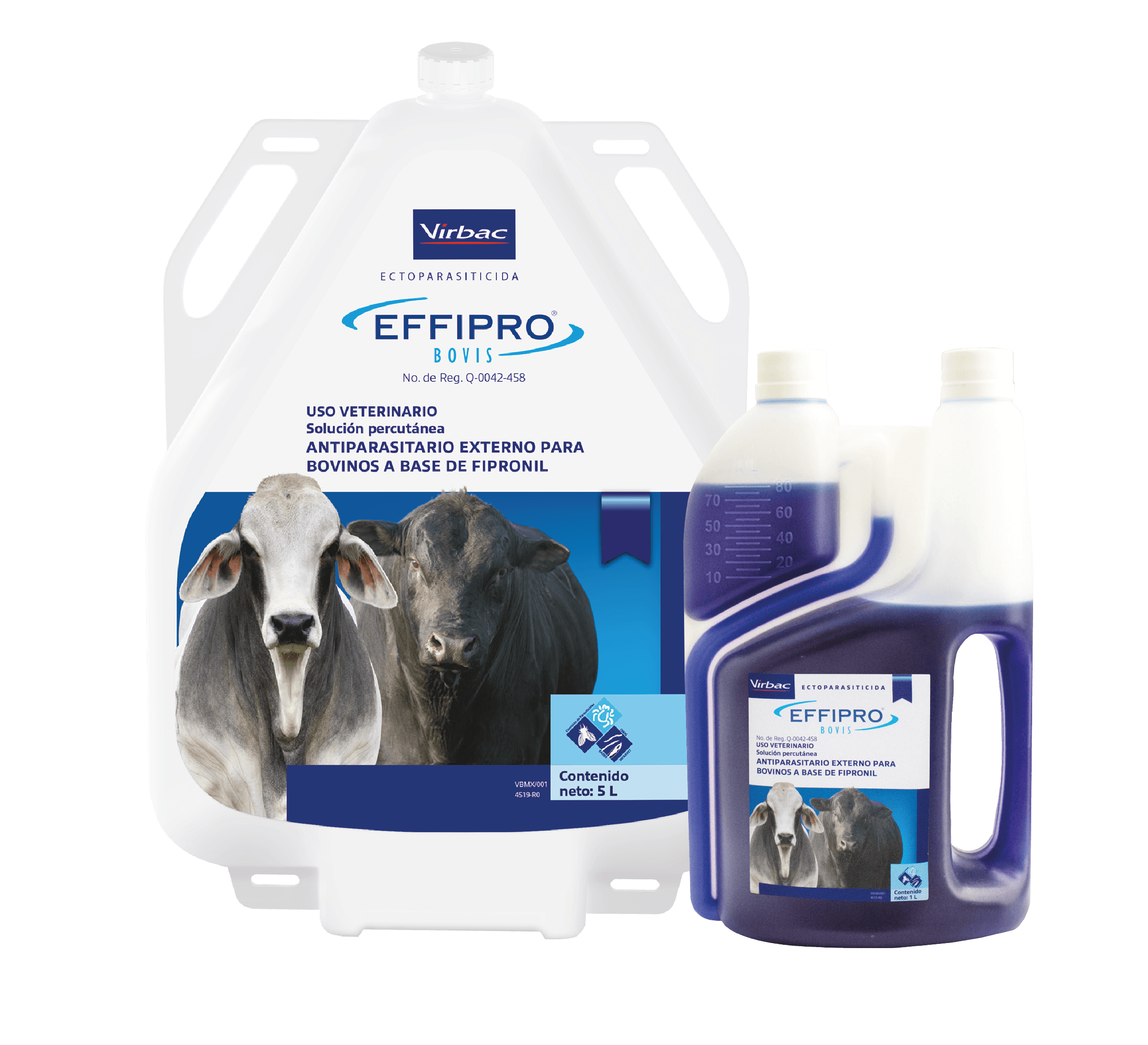 EFFIPRO® BOVIS es un antiparasitario externo para uso en bovinos (productores de carne), indicado en el manejo sanitario animal y control de infestaciones de la mosca del cuerno (Haematobia irritans), garrapatas (Rhipicephalus (Boophilus) microplus), piojos masticadores (Damalinia bovis), piojos chupadores (Linognathus vituli) y miasis cutánea o furuncular (Dermatobia hominis).
